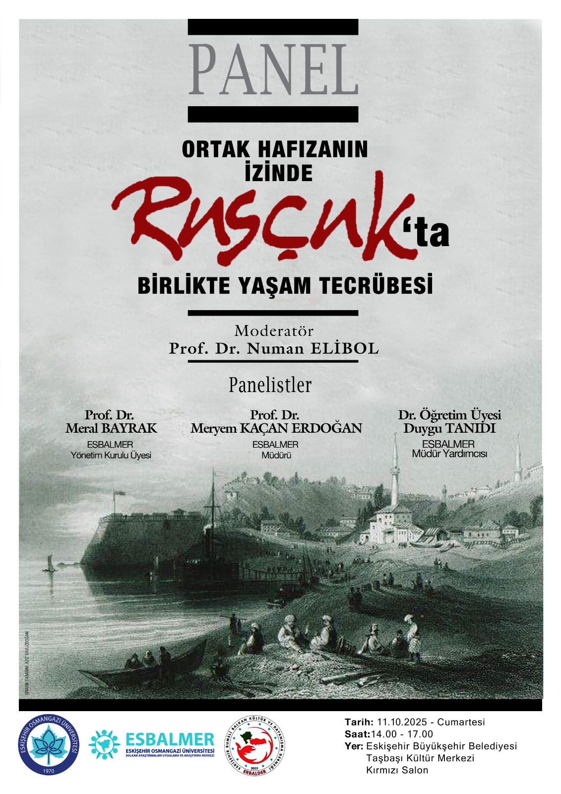 Bölümümüz öğretim üyelerinden Prof. Dr. Numan Elibol'un moderatörlüğünde Prof. Dr. Meral Bayrak, Prof. Dr. Meryem Kaçan Erdoğan ve Dr. Öğr. Üyesi Duygu Tanıdı tarafından, Eskişehir Büyükşehir Belediyesi Taşbaşı Kültür Merkezi'nde "Ortak Hafızanın İzinde Rusçuk'ta Birlikte Yaşam Tecrübesi" adlı panel gerçekleştirilmiştir.